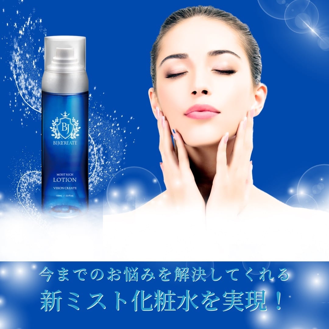 BJ モイストリッチローション【美女クリエイト】 ✼••┈┈••✼••┈┈••✼••┈┈••✼••┈┈••✼ 【内容量】150ml ✼••┈┈••✼••┈┈••✼••┈┈••✼••┈┈••✼ 海洋深層水×ヒト幹細胞 深海からの贈り物「超微粒子ミスト化粧水」 海洋深層水とは 水深200m以深のところを流れている海水のこと。 太陽の光がほとんど届かず、水温が年間を通してほとんど変化しません。このため、水質を悪化させる有機物や細菌、環境ホルモンなどをほとんど含んでいないのです。表層水に比べて清潔で、ミネラルが豊富、水質も安定しているので、化粧品に使うと美肌に効果があると言われています。 ・分子量が小さく、お肌への浸透性がとても高い ・天然のミネラルをバランスよく含む海洋深層水 ※高知県室戸岬の海洋深層水を採用 ヒト幹細胞培養液エキス 肌本来のチカラを呼び覚ますヒト幹細胞培養液エキス配合。 ヒト幹細胞培養液エキスがお肌のハリ・弾力のもとになるコラーゲン・ヒアルロン酸・エラスチンを作り出す細胞の働きを活発にし、お肌の生まれ変わりを促します。肌本来の再生力にアプローチして、シワ、たるみのない若々しい肌へ導きます。 ・肌細胞を活性化 ・ハリのある若々しいお肌へ ・弾力のあるふっくら肌へ 〝超微粒子ミストボトル″採用 -海洋深層水をベースに美容成分を配合- こだわりの美容成分を配合した化粧水を、今までにない細かい霧状のミストで噴霧できるので、角質層のすみずみまで潤いを行き渡らせることが可能になりました。超微粒子ミストボトルから噴霧されたスパリア シー モイストウォーターは、分子量の小さい海洋深層水をベースにしているので、さらに角質層のすみずみまで行き渡らせることが可能になりました。 ・細かい粒子のミストが出るため、美容成分の浸透性に優れています。粒子が小さいのでメイクの上からでも、メイクを崩さず潤いを与えられます。メイク直しが要らず、メイク直後の状態が続きます。 ・持ち運びに便利 / 保管・破棄が簡単 / 飛行機で運べる ✼••┈┈••✼••┈┈••✼••┈┈••✼••┈┈••✼ 【使用方法】洗顔後、顔から約20cm程度離し、顔全体に適量を噴霧します。噴霧後は肌にしっかりなじませてください。メイクの上からでもお使いできます。 ✼••┈┈••✼••┈┈••✼••┈┈••✼••┈┈••✼ 【使用上の注意】 ■お肌に異常が生じていないかよく注意して使用してください。 ■傷やはれもの、しっしん等、異常がある部位にはお使いにならないでください。 ■化粧品がお肌に合わないときや使用中、赤味、はれ、かゆみ、刺激、色抜け(白斑等)や黒ずみ等の異常が現れた場合、使用したお肌に、直射日光があたって上記のような異常が現れた場合は、使用を中止してください。そのまま化粧品類の使用を続けますと、症状を悪化させることがありますので、皮膚科専門医等にご相談されることをおすすめします。 ■乳幼児の手の届かないところに保管してください。 ■極端に高温又は低温の場所、直射日光のあたる場所には保管しないでください。 ■目に入ったときは、直ちに洗い流してください。 ✼••┈┈••✼••┈┈••✼••┈┈••✼••┈┈••✼ ■日本製 ■合成香料フリー・合成着色料フリー・パラベンフリー